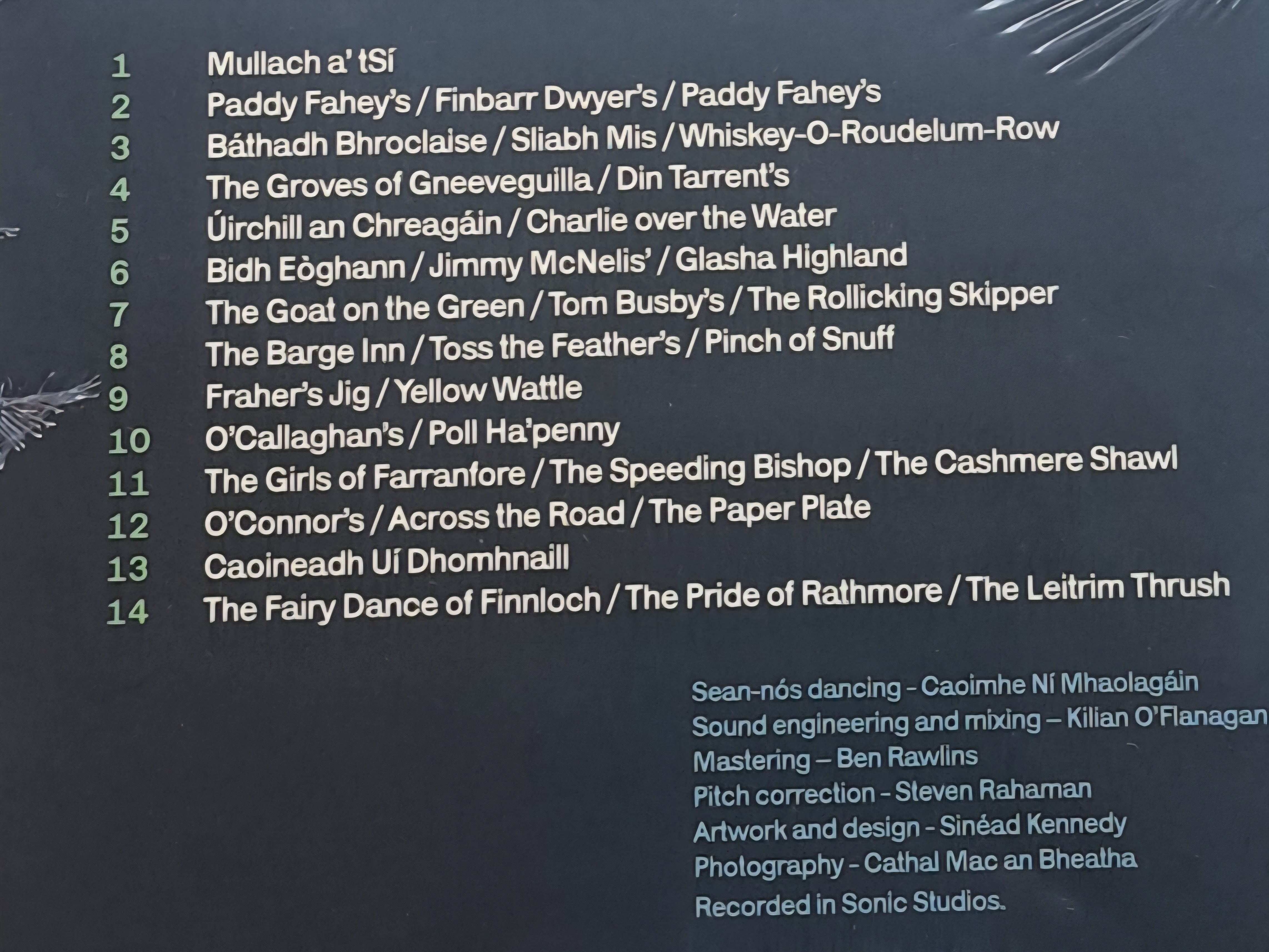 It starts with a suantraí, Mullach an tSí, from the singing of Pádraigín Ní Uallacháin  a version of which was recorded by Pádraig O' Keeffe and titled The Old Man Rocking the Cradle  and  finishes with a set of reels, the first of which is The Fairy Dance of Finnloch.